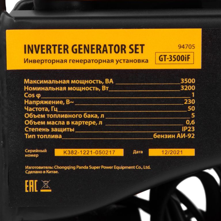 <p>Инверторный генератор Denzel GT-3500iF 94705 мощностью 3,5 кВт, в открытом корпусе, с ручным стартом, — легкий и экономичный, но при этом достаточно мощный, с ним легко справится даже неопытный пользователь. Идеально подходит для использования на даче, в гараже, в мастерской и на природе. Четырехтактный двигатель Denzel Long Life мощностью 7 л.с. и объемом 212 куб. см работает стабильно и имеет относительно невысокий уровень шума (97 дБ) и вибраций. Прочная рама защищает рабочие элементы от повреждений в процессе работы и транспортировки.</p><h2>Преимущества</h2><ul><li>Высокое качество тока — генератор оптимален для подключения наиболее чувствительных к перепадам напряжения приборов: компьютерной техники, газовых котлов с электронным управлением, охранных и пожарных систем.</li><li>Защита от поломки — при низком уровне масла, перегрузке или коротком замыкании двигатель автоматически отключается.</li><li>Долговечность — полностью стальные коленвал и распредвал, закаленные токами высокой частоты, чугунная гильза цилиндра и альтернатор с медной обмоткой увеличивает срок службы аппарата.</li><li>Визуальный контроль — индикаторы на передней панели информируют о работе генератора, недостаточном уровне топлива и о перегрузке.</li><li>Долгая работа без дозаправки — генератор способен работать почти 4,5 часов на 5 л топлива.</li><li>Оптимизированная антивибрационная система — преждевременный износ внутренних узлов исключен.</li><li>2 розетки 230 В на передней панели — можно одновременно подключать пару потребителей без использования удлинителя.</li><li>Влагозащита электрокомпонентов — крышки на розетках блокируют попадание частиц воды и пыли на контакты.</li><li>Простое обслуживание — открытый корпус обеспечивает легкий доступ к фильтру, картеру и свече зажигания.</li><li>Гарантия 3 года — высокое качество генератора подтверждено производителем.</li></ul> |