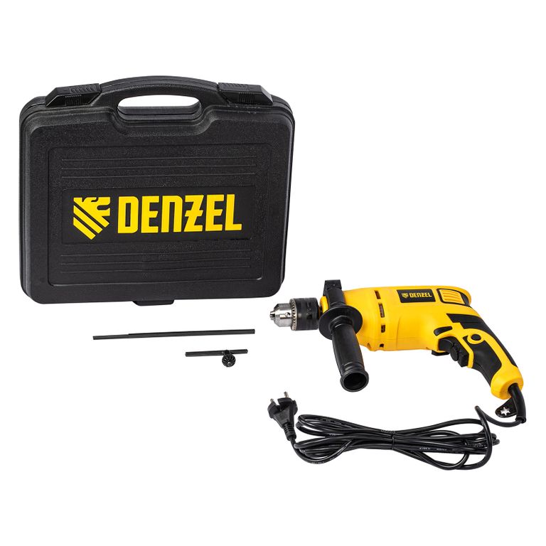 <p>Ударная дрель Denzel ID-650 26304 мощностью 650 Вт поддерживает скорость вращения оснастки 0-3000 об/мин и частоту ударов 48000 уд/мин. Используется для ручного или ударного сверления металла, древесины, легкого бетона, кирпича, плитки или пластика. Сверлит отверстия диаметром до 25 мм в древесине, до 13 мм в бетоне и до 13 мм в металле. Эффективное сверление твердых материалов обеспечивает массивный промщит ударного механизма. Дрель работает со сверлами с диаметром хвостовика 1,5-13 мм, что позволяет эффективно решать различные задачи.</p><h2>Преимущества</h2><ul><li>Выбор оптимального режима — предусмотрена плавная регулировка частоты вращения патрона и возможность отключения ударного режима для работы с материалами разной плотности.</li><li>Высокий ресурс — медная обмотка двигателя, усовершенствованная конструкция щеточного узла и прочный пластиковый корпус выдерживают интенсивное использование. </li><li>Безопасность пользователя — токопроводящие элементы имеют двойную изоляцию</li><li>Реверс — можно изменять направление вращения патрона для использования левосторонних сверл или шлифовальной оснастки.</li><li>Удобное использование — клавиша фиксации кнопки включения позволяет избежать самопроизвольного переключения частоты вращения.</li><li>Надежная фиксация оснастки — трехкулачковый самоцентрирующийся патрон затягивается с помощью ключа.</li><li>Сверление отверстий заданной глубины — предусмотрена возможность установки специального ограничителя.</li><li>Держатель для ключа — аксессуар не потеряется во время работы и хранения.</li><li>Защита от перегрева — вентиляционные отверстия на корпусе обеспечивают эффективный отвод тепла.</li><li>Свободное перемещение по рабочей зоне — длина кабеля питания составляет 3 м.</li><li>Комфортная работа — основная и боковая рукоятки не выскальзывают из рук, дрель весит 1,85 кг, что позволяет долго работать без ощущения усталости.</li><li>Удобное хранение и транспортировка — дрель поставляется в прочном кейсе.</li><li>Гарантия |