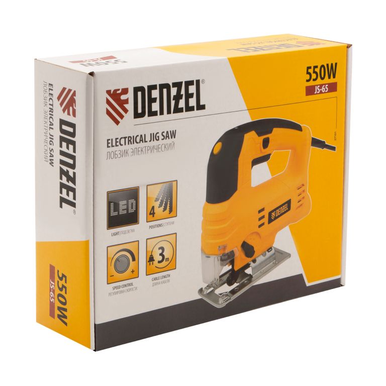 <p>Электрический лобзик Denzel JS-65 27101 мощностью 550 Вт предназначен для прямого и фигурного реза листовых материалов из металла, древесины, и пластмассы, а также для вырезки варочных панелей или отверстий под мойки в столешницах. Двигатель обеспечивает частоту хода оснастки 1000-2800 ход/мин. Для резки древесины максимальная глубина пропила составляет 65 мм, для цветных металлов — 12 мм, а для стали — 6 мм. Угол наклона подошвы регулируется, что позволяет совершать пропилы под углом до 45°.</p><p>Модель JS-65 — самая легкая и компактная в линейке производителя, ее размеры минимальны, а вес составляет всего 2,2 кг, благодаря чему можно без усталости работать долгое время. Несмотря на свою компактность, инструмент не уступает крупногабаритным аналогам в эффективности и особенно удобен во вспомогательных строительных работах. Лобзик подключается к сети, поэтому время работы не ограничено.</p><h2>Преимущества</h2><ul><li>4 ступени регулировки маятникового хода — можно выбрать оптимальную амплитуду для решения конкретной задачи.</li><li>Подсветка рабочей зоны — работать комфортно даже в условиях слабого освещения.</li><li>Чистая работа — отключаемая функция сдува опилок позволяет подключить пылесос к специальному патрубку для эффективного удаления пыли.</li><li>Быстрая замена полотна — благодаря бесключевому фиксатору оснастки использование дополнительных инструментов не требуется.</li><li>Безопасность — прозрачный поворотный щиток и металлический ограничитель защищают мастера от травм и разлетающихся опилок.</li><li>Фиксация кнопки пуска — клавишу включения не нужно удерживать, что обеспечивает комфорт во время продолжительной работы.</li><li>Точная работа — стальная опорная платформа обладает необходимой жесткостью, что позволяет получать аккуратные срезы.</li><li>Широкий спектр работ — при использовании специальной оснастки (не входит в комплект поставки) возможна резка кожи и резины.</li><li>Высокая эффективность — маятниковый ход сообщает пилке дополнительную а |