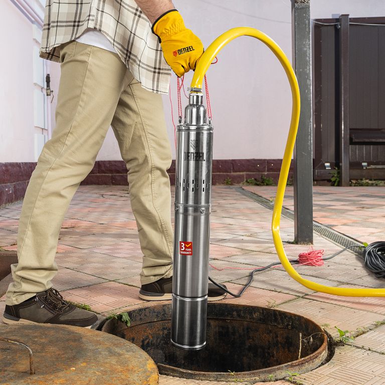 <p>Скважинный насос Denzel DWS-4-150 97254 производительностью 2000 л/ч, диаметром 4″ и мощностью 1300 Вт обеспечивает напор до 150 м. Предназначен для подачи чистой воды из скважин, колодцев, систем водоснабжения, различных накопителей и пресных водоемов с глубины до 27 м (с наращиванием кабеля — до 80 м). Винтовая насосная часть обеспечивает напор, достаточный не только для полива приусадебных участков, но и для организации бытового водоснабжения. </p><h2>Преимущества</h2><ul><li>Надежность — маслонаполненный двигатель с мембраной компенсации теплового расширения обеспечивает стабильную работу даже при интенсивных нагрузках.</li><li>Коррозионная стойкость — корпус, шпильки и болты выполнены из нержавеющей стали.</li><li>Электробезопасность — длина съемного сетевого кабеля составляет 30 м (возможно его наращивание), штепсельная вилка оснащена заземляющим контактом.</li><li>Водонепроницаемость — рабочий узел защищен от попадания воды по стандарту IPX8. </li><li>Система защиты от перегрева — при превышении допустимой температуры двигатель отключается для предотвращения поломки.</li><li>Быстрое начало работы — напорная магистраль легко подключается к выходному отверстию, образуя герметичное соединение, насос не нужно заполнять водой, достаточно погрузить его в скважину и включить.</li><li>Несложная установка — в верхней части корпуса имеются проушины для закрепления троса, при помощи которого насос погружается в воду.</li><li>Работа без остановок — насос не останавливается при попадании песка и других частиц размером до 0,5 мм, заборная часть легко очищается при необходимости.</li><li>Простая подготовка к хранению — достаточно промыть насос, слить из него воду и протереть чистой тряпкой.</li><li>Гарантия 3 года — надежность насоса подтверждена производителем.</li></ul> |