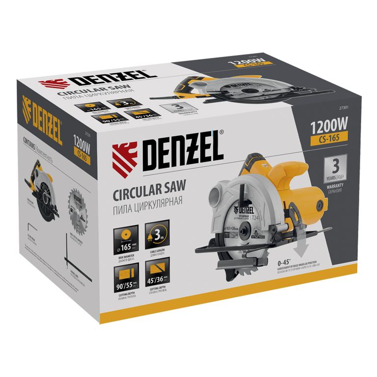 <p>Циркулярная пила Denzel CS-165 мощностью 1200 Вт с пильным диском диаметром 165 мм предназначена для реза листового пиломатериала, ДСП, ДВП, а также для раскроя фанеры. Самая компактная из линейки Denzel CS, она весит всего 3,6 кг — это значительно снижает нагрузку на руки мастера и позволяет управлять инструментом одной рукой.,Двигатель мощностью 1,2 кВт обеспечивает частоту вращения пильного диска 5500 об/мин. Специальный рычаг-фиксатор позволяет легко регулировать глубину пропила от 0 до 55 мм.</p><h2>Преимущества</h2><ul><li>Широкий спектр работ — при применении специальной оснастки пила может использоваться для реза тонкого мягкого металла, пластика и ламинированных материалов.</li><li>Высокая точность — стальная параллельная направляющая помогает осуществлять ровные прямые пропилы.</li><li>Оптимальное положение пильного диска — регулировочный винт позволяет точно настроить угол наклона в диапазоне 0-45 градусов.</li><li>Защита от случайного пуска — блокировка кнопки включения позволяет избежать внезапного запуска пилы, что делает работу с инструментом более безопасной.</li><li>Индикатор подключения к сети — световое обозначение позволяет определить готовность двигателя к запуску.</li><li>Эффективная система удаления опилок — к пиле можно подключить пылесос или пылесборник, чтобы сохранить рабочую площадку в чистоте.</li><li>Безопасность — подвижный защитный кожух закрывает верхнюю часть пильного диска и исключает контакт с лезвием</li><li> после отключения пилы кожух полностью изолирует диск от внешних воздействий.</li><li>Быстрая смена оснастки — с помощью кнопки блокировки шпинделя и ручки отвода защитного кожуха даже начинающий мастер сможет без труда заменить пильный диск.</li><li>Оптимальная длина сетевого кабеля 3 м — такое решение обеспечивает расширенную рабочую зону. </li><li>Гарантия 3 года — высокое качество пилы Denzel подтверждено производителем.</li></ul> |