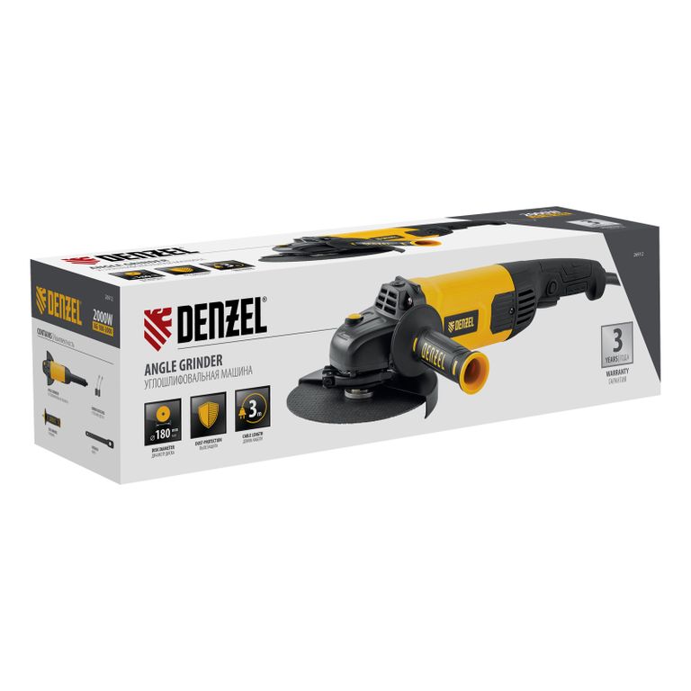 <p>Угловая шлифовальная машина Denzel AG180-2000 26912 мощностью 2000 Вт совместима с насадками максимальным диаметром 180 мм, поддерживает частоту вращения шпинделя 8500 об/мин, благодаря чему эффективно справляется с обработкой и зачисткой поверхностей, а также резкой, шлифовкой металла толщиной до 60 мм и камня. Пригодится дома, в гараже и на даче.</p><h2>Преимущества</h2><ul><li>Высокий ресурс — усиленная пылезащита обеспечивает 450 часов работы даже при резке камня или бетона.</li><li>Безопасность — кнопка блокировки предотвращает случайный запуск УШМ.</li><li>Надежность — усовершенствованная конструкция щеточного узла обеспечивает стабильную работу двигателя.</li><li>Быстрая подготовка к работе — для установки защитного кожуха на УШМ не требуются дополнительные инструменты.</li><li>Удобное обслуживание — в комплект входят специальный ключ и запасные угольные щетки.</li><li>Мобильность — кабель длиной 3 м позволяет увеличить рабочую зону.</li><li>Эргономичность — боковую рукоятку можно установить в 1 из 3 положений: слева, справа или сверху.</li><li>Комфортная работа — прорезиненная рукоятка удобно лежит в руке и не выскальзывает из ладони.</li><li>Гарантия 3 года — качество шлифовальной машинки подтверждено производителем.</li></ul> |