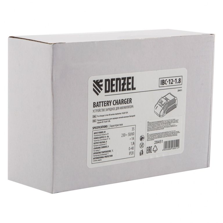 <h2>Автоматическое зарядное устройство нового поколения Denzel IBC-12-1.8 28451 предназначено для аккумуляторных батарей Denzel с номинальным напряжением 12 В, максимальный ток заряда составляет 1,8 А. Обеспечивает бережную и максимальную зарядку АКБ для получения высокой производительности инструментов Denzel.</h2><ul><li> </li><li>Преимущества</li><li>Долговечность аккумуляторов — интеллектуальная зарядка происходит в щадящем режиме до глубокого заряда с сохранением КПД и без снижения емкости.</li><li>Электронное управление — процесс работы сопровождается непрерывным контролем степени заряда и температуры.</li><li>Автоотключение — устройство прекращает работу по окончании зарядки.</li><li>Работа без риска поломки — производитель предусмотрел систему защиты ЗУ и АКБ от перегрузок, короткого замыкания и переполюсовки контактов.</li><li>Удобный контроль — LED-индикатор сообщит об окончании процесса зарядки.</li><li>Длина кабеля питания 1,6 м — можно расположить устройство в удобном месте.</li><li>Малый вес 0,38 кг — зарядное устройство удобно брать с собой на рабочую площадку.</li></ul> |