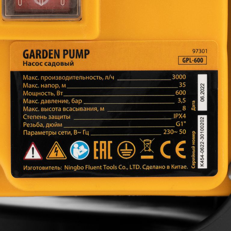<p>Садовый поверхностный насос Denzel GPL600 97301 мощностью 600 Вт и производительностью 3000 л/ч, с корпусом из пластика, предназначен для забора чистой воды из колодцев, водоемов, различных резервуаров, и подъема ее на высоту до 35 м. Используется для проведения поливочных работ или организации системы водоснабжения в загородном доме. Способен обеспечить водой несколько точек водоразбора.</p><h2>Преимущества</h2><ul><li>Надежность — рабочее колесо из стеклонаполненного пластика не разрушается под воздействием воды и выдерживает интенсивную эксплуатацию.</li><li>Степень защиты IPX4 — внутренние элементы надежно изолированы от брызг воды.</li><li>Небольшой вес 6 кг — корпус насосной части из легкого, но прочного пластика не утяжеляет конструкцию насоса.</li><li>Комфортное перемещение — в верхней части корпуса имеется удобная ручка.</li><li>Гарантия 3 года — высокое качество насоса подтверждено производителем.</li></ul> |