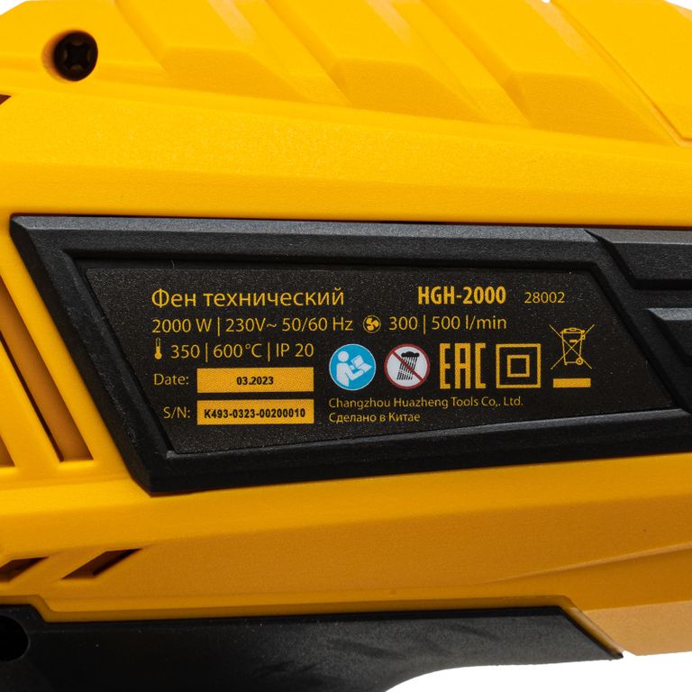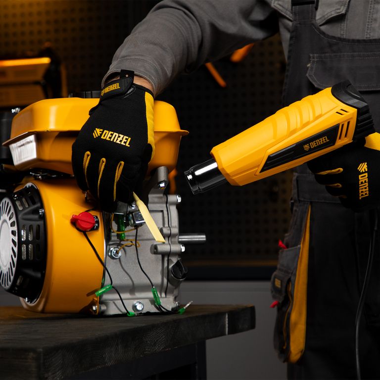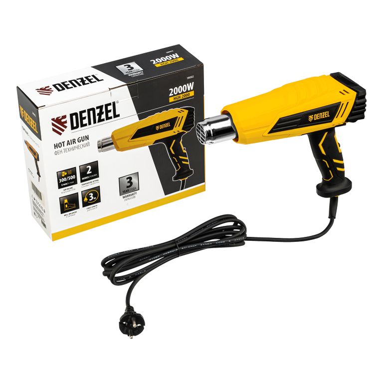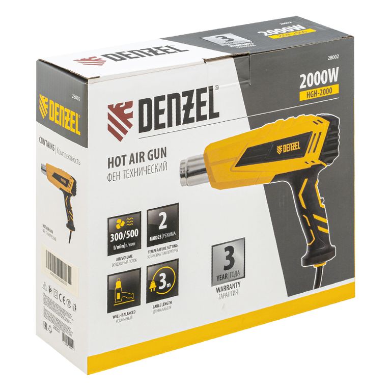 <p>Фен технический Denzel HGH-2000 28002 мощностью 2000 Вт поддерживает 2 режима работы, обеспечивая стабильную производительность на уровне 300 или 500 л/мин. В зависимости от выбранного режима рабочая температура составляет 350 °C или 600 °C. Фен позволяет просушивать и снимать лакокрасочные покрытия, производить сварку пластиковых изделий, паять и размораживать трубы, проводить дезинфекцию поверхностей с помощью потока горячего воздуха, а также решать множество других задач.</p><h2>Преимущества</h2><ul><li>Быстрое переключение между режимами — для установки нужной температуры и производительности достаточно перевести выключатель в соответствующее положение.</li><li>Надежность — нагревательный элемент с каркасом из жаростойкой слюды рассчитан на длительное использование.</li><li>Термозащита — в случае перегрева двигатель автоматически отключится.</li><li>Электробезопасность — токопроводящие элементы имеют двойную изоляцию, что минимизирует вероятность поражения электрическим током.</li><li>Комфортная работа — фен весит всего 680 г, эргономичная прорезиненная рукоятка надежно ложится в руку.</li><li>Подтвержденное качество — гарантия на фен действует 3 года.</li></ul> |