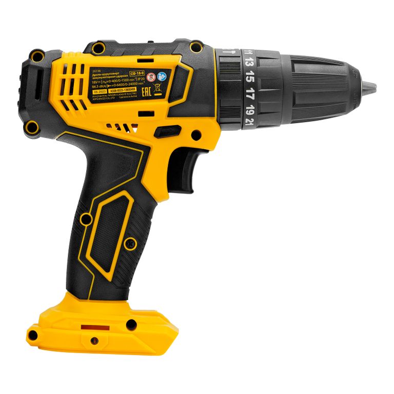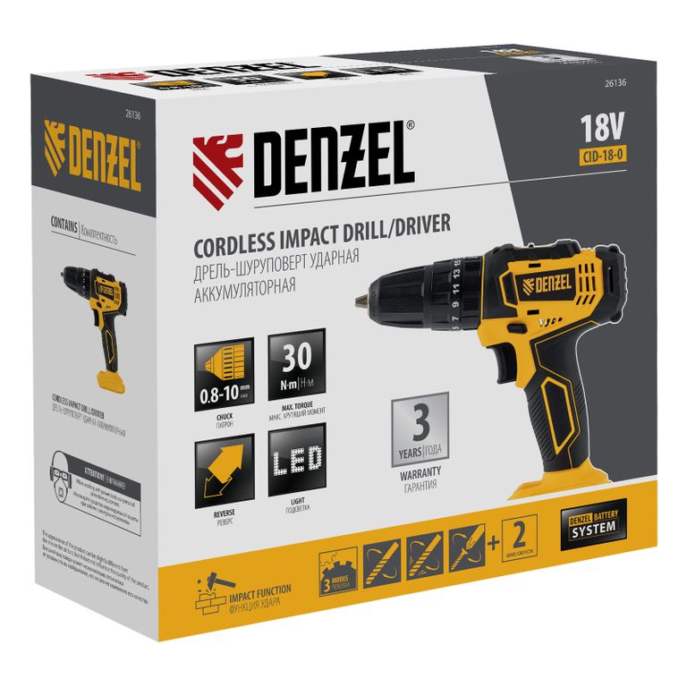 <p>Ударная аккумуляторная дрель-шуруповерт Denzel CID-18-0 26136 работает от аккумулятора с рабочим напряжением 18 В и используется для сверления отверстий, а также монтажа и демонтажа резьбовых соединений. Инструмент развивает крутящий момент до 30 Н·м. Ударная функция позволяет справляться с перетянутым и прикипевшим крепежом, а также сверлить отверстия в твердых материалах, например, в кирпиче. Максимальный диаметр отверстий в кирпиче составляет 10 мм, в металле — 13 мм, в древесине — 25 мм.,Инструмент работает от аккумулятора Li-Ion с рабочим напряжением 18 В. Аккумулятор и зарядное устройство приобретаются отдельно.</p><h2>Преимущества</h2><ul><li>Удобная настройка рабочих параметров — частота вращения регулируется в диапазоне 0-400 и 0-1500 об/мин для работы с крепежом и сверления соответственно, частота ударов регулируется в диапазоне 0-6400 и 0-24000 об/мин.</li><li>21+1 ступень регулировки крутящего момента — можно выбрать оптимальное усилие затяжки в зависимости от типа крепежа и плотности материала.</li><li>Быстрая замена оснастки — производитель предусмотрел функцию блокировки шпинделя, одномуфтовый патрон удобен для установки сверла или насадки одной рукой.</li><li>Высокая точность выполняемых работ — тормоз свободного выбега позволяет мгновенно остановить вращение шпинделя после выключения и избежать перетягивания крепежа.</li><li>LED-подсветка рабочей зоны — дрелью-шуруповертом удобно работать в условиях слабой освещенности.</li><li>Реверс — функция обратного вращения позволяет работать с болтами и гайками, имеющими левую резьбу, а также быстро переходить от закручивания к откручиванию крепежа.</li><li>Универсальность — дрель-шуруповерт совместима с любым Li-Ion аккумулятором и зарядным устройством единой платформы Denzel Battery System 18V.</li><li>Небольшой вес 1,3 кг (вместе с установленным аккумулятором) — длительная работа не вызывает ощущение усталости.</li><li>Гарантия 3 года — надежность инструмента подтверждена производителем.</li></ul> |