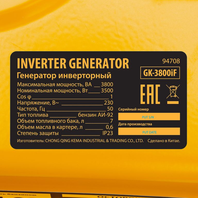 <p>Инверторный генератор Denzel GK-3800iF 94708 максимальной мощностью 3,8 кВт, с ручным стартом, поддерживает напряжение 230 В и предназначен для питания осветительных приборов, бытовой техники, электроинструмента и т.д. в условиях отсутствия электросети или перебоев в ее работе. Обеспечивает подачу стабильного тока, подходит для подключения потребителей, чувствительных к качеству электроэнергии: газовых котлов, серверных станций, цифровой техники. Предусмотрена возможность подключения мобильных устройств к выходу USB 5 В. Клеммы постоянного тока 12 В можно использовать для зарядки автомобильных аккумуляторов. Генератор незаменим на дачном участке.</p><h2>Преимущества</h2><ul><li>Долговечность — надежный четырехтактный двигатель и альтернатор с медной обмоткой обеспечивают стабильную работу генератора на протяжении всего срока службы.</li><li>Защита от перегрузки — в случае превышения допустимой нагрузки предохранитель останавливает работу генератора для предотвращения аварийной ситуации.</li><li>Защита двигателя — генератор не запускается при низком уровне масла (срабатывает индикатор), фильтры предотвращают попадание посторонних примесей в топливо и твердых частиц в цилиндр.</li><li>Удобное управление — цифровой дисплей отображает значения напряжения, частоты, времени работы, также предусмотрена индикация уровня масла и возможность настройки вывода параметров.</li><li>Низкий расход топлива — при подключенной нагрузке до 70% от номинальной мощности генератор может работать в экономичном режиме: число оборотов двигателя автоматически снижается при отключении потребителей.</li><li>Контроль уровня топлива — при помощи индикатора легко определить, когда следует заправить бак.</li><li>Надежная изоляция внутренних компонентов — генератору присвоена степень защиты IP23, что означает устойчивость к попаданию брызг воды и твердых частиц размером от 12,5 мм. </li><li>Простое обслуживание — воздушный и топливный фильтр легко извлекаются для очистки и замены.</li><li>Гарантия |