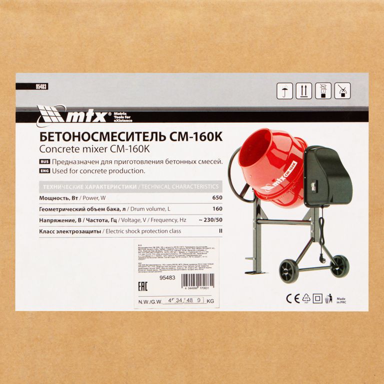 <p>Бетоносмеситель может использоваться как на собственном участке, так и на небольших объектах для ремонтных, строительных, отделочных работ. Ёмкость бака составляет 160 л, что позволяет получать на выходе до 90 л готовой строительной смеси.,Мешалка отличается простотой и надежностью. Фиксатор штурвала позволяет наладить дозированную подачу смеси.</p><h2>Преимущества</h2><ul><li>Влагозащита — кнопки управления закрыты защитным кожухом от попадания воды и грязи, что повышает безопасность работы .</li><li>Термозащита — в случае перегрузки двигатель моментально останавливается, это обеспечивает сохранность внутренних узлов и продлевает срок службы всего оборудования.</li><li>Прочная основа — нагрузка равномерно распределяется по раме благодаря квадратному профилю и двум подкосам с ребрами жесткости. Конструкция уверенно выдерживает полностью заполненный бак.</li><li>Продуманность до мелочей — между деталями бака находится резиновая прокладка, а не герметик. Благодаря этому барабан легко разбирается, например, для транспортировки.</li><li>Надежное крепление опорной балки — узлы крепления траверсы полностью охвачены на 360°, также в месте фиксации использованы металлические пластины, все это делает конструкцию прочной и долговечной.</li><li>Безопасное использование — ведущая шестерня закрыта кожухом, поэтому затягивание посторонних предметов исключено.</li><li>Эффективная конструкция — расширение бака позволило добиться более тщательного перемешивания смеси и снижения нагрузки на подшипники, а расположение внутренних лопастей под углом — предотвращения выдавливания раствора.</li><li>Полная окраска бака и венца — барабан, лопасти и чугунный зубчатый венец окрашены на 100%, это обеспечивает защиту металла от коррозии и продлевает срок службы бетономешалки.</li><li>Мобильность — оснащенная двухкомпонентными широкими колесами 180 мм из прочного пластика, бетономешалка легко перевозится по строительной площадке.</li><li>Надежная фиксация барабана — привод фиксации бака выпо |