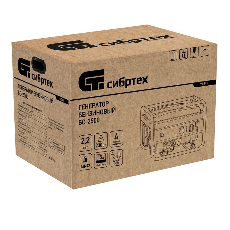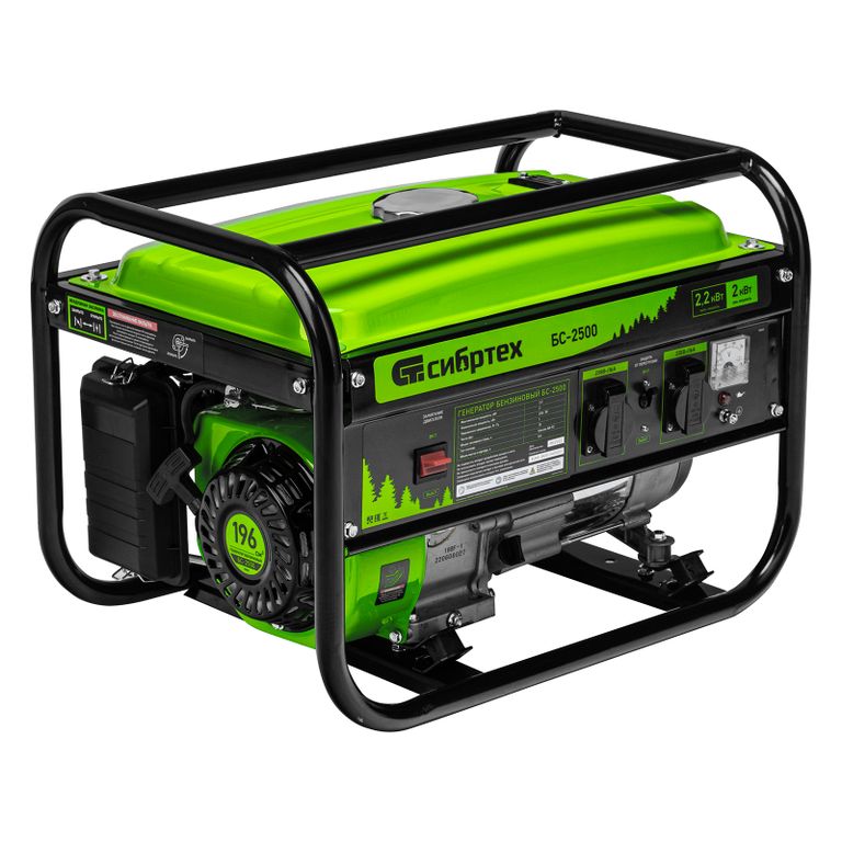 <p>Бензиновый генератор Сибртех БС-2500 94542 на 230 В, максимальной мощностью 2,2 кВт, с 4-тактным двигателем и баком объемом 15 л, идеально подходит для использования на даче, на природе или в мастерской. Небольшой вес 34,5 кг и компактность позволяют легко перевозить и брать его с собой. Мощности 2 кВт достаточно для одновременного подключения холодильника и микроволновой печи. </p><h2>Преимущества</h2><ul><li>Работа без скачков напряжения — благодаря блоку AVR к генератору можно подключать даже чувствительную технику.</li><li>Простая эксплуатация — все элементы управления расположены на передней панели.</li><li>Контроль рабочих параметров — встроенный вольтметр позволяет отслеживать напряжение в сети, а топливный индикатор — уровень бензина в баке.</li><li>Защита поршневой группы — специальный датчик не допускает старт генератора с низким уровнем масла в картере.</li><li>Низкий расход топлива — бака объемом 15 л хватает на 12,5 ч работы без дозаправки.</li><li>Надежность — защита от перегрузки и короткого замыкания продлевает срок службы генератора.</li><li>Стабильная работа двигателя — система воздушного охлаждения обеспечивает эффективный отвод тепла.</li><li>Прочная конструкция — стальная рама надежно защищает генератор от повреждений.</li></ul> |