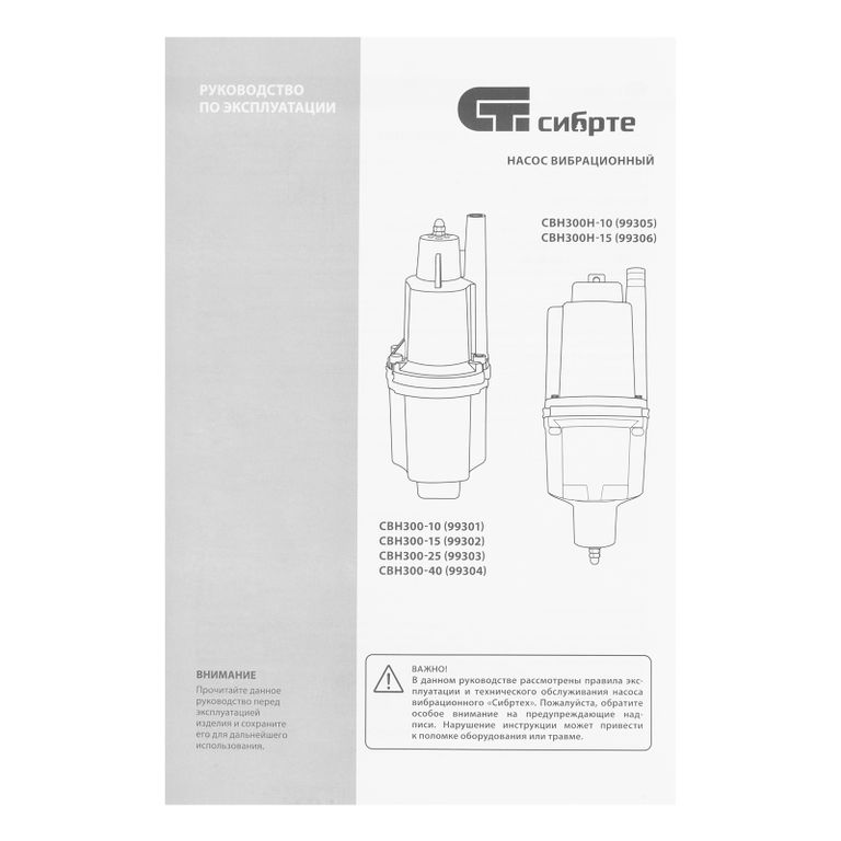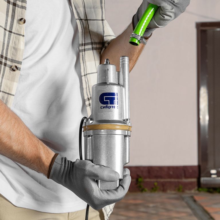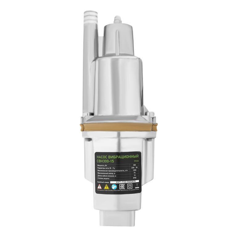 <p>Вибрационный насос Сибртех СВН300-15 99302 мощностью 300 Вт, с кабелем длиной 15 м, способен поднимать чистую воду с глубины до 5 м из колодцев, резервуаров и водоемов со скоростью 1200 л/ч на высоту до 75 м. Используется для организации систем орошения и водоснабжения на даче, также с его помощью можно производить осушение подвалов, погребов, цокольных этажей. Напора и рабочего давления до 7,5 бар достаточно для подачи воды на 2-3 этаж.</p><h2>Преимущества</h2><ul><li>Простой монтаж — с помощью троса, закрепленного в проушинах на корпусе, насос нужно опустить в колодец или резервуар и зафиксировать в вертикальном положении.</li><li>Прочность — алюминиевый корпус устойчив к механическим повреждениям.</li><li>Высокий ресурс — за счет системы верхнего забора воды двигатель не перегревается.</li><li>Возможность подачи питьевой воды — мембрана изготовлена из пищевой резины, безвредной для здоровья.</li><li>Надежная конструкция — детали корпуса скреплены болтами, поэтому даже при интенсивных вибрациях соединения не ослабляются.</li><li>Герметичность — насос имеет степень защиты IPX8, поэтому вода не попадает на электронные компоненты.</li><li>Удобный сетевой шнур — кабель длиной 15 м позволяет подключить насос к розетке вдали от воды.</li><li>Минимальное обслуживание — при правильной эксплуатации не требуется залив воды, очистка фильтра, замена рабочих частей.</li><li>Необходимые аксессуары в комплекте — трос для погружения и хомут для закрепления шланга прилагаются к насосу.</li><li>Небольшой вес 3,6 кг — насос легко транспортировать и устанавливать.</li></ul> |