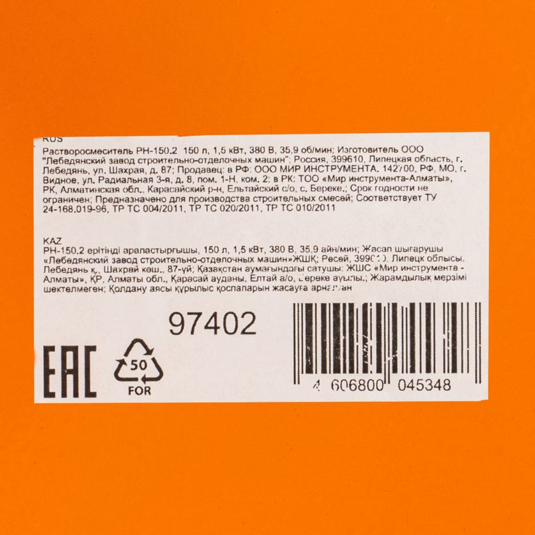 <p>Растворосмеситель РН-150.2 97402 мощностью 1,5 кВт, с барабаном объемом 150 л, работает от сети 380 В, обеспечивает частоту вращения вала 35,9 об/мин и предназначен для приготовления влажных растворов и сухих смесей. Кладочные, облицовочные и штукатурные смеси производятся в соответствии с ГОСТ 28013 с подвижностью от 5 см по конусу (ГОСТ 5802). 4 подвижные лопасти, расположенные на горизонтальном валу, обеспечивают быстрое и качественное перемешивание компонентов раствора за 120 секунд. Сразу же после выгрузки полученной смеси можно начинать новый цикл, что значительно ускоряет рабочий процесс. Растворосмеситель используется для заливки и обработки фундамента, кладки кирпича, выравнивания стен и проведения иных работ.</p><h2>Преимущества</h2><ul><li>Экологичность — во время работы растворосмесителя отсутствуют вредные выхлопы.</li><li>Эффективность — расширенное отверстие для засыпания компонентов позволяет сократить время подготовки к работе и уменьшить количество отходов.</li><li>Тщательное перемешивание — резиновые пластины на лопастях регулируются, что позволяет уменьшать зазор между ними и стенками бака.</li><li>Продуманная конструкция — двигатель отделен от блока смесителя, что позволяет минимизировать воздействие вибраций на основные элементы и продлить срок службы растворосмесителя.</li><li>Влагозащита — кнопки запуска и остановки закрыты прозрачным кожухом, исключающим попадание воды и грязи во внутренний узел.</li><li>Безопасная эксплуатация — решетка из прочного металла предотвращает попадание инородных предметов в бак, расширенная книзу металлическая стойка обеспечивает устойчивое положение агрегата.</li><li>Надежность — металлический корпус устойчив к механическим повреждениям, все детали растворосмесителя прочно скреплены при помощи болтовых соединений.</li><li>Защита от разрушения — корпус окрашен антикоррозийной краской.</li><li>Простое обслуживание — резиновые скребки легко снимаются для очистки или замены.</li><li>Удобная подача раствора — ручн |